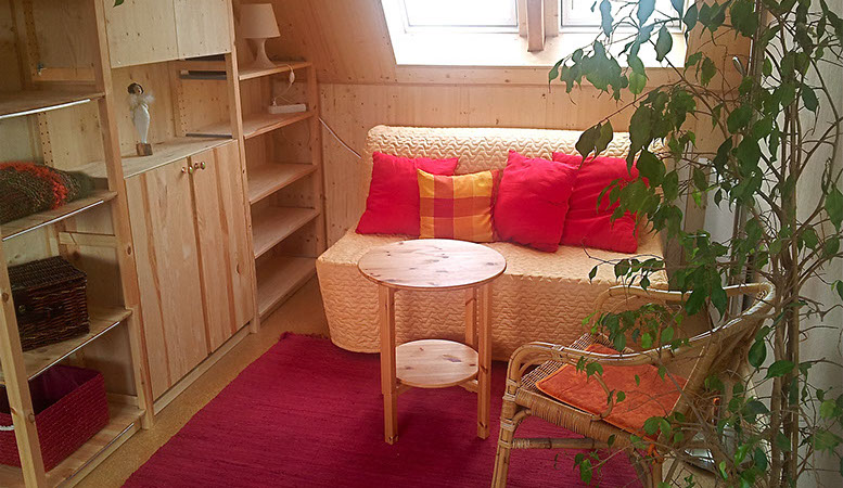 Die Gästewohnung hat 2 und ein halbes Zimmer . Im großen Zimmer stehen ein 1,40m breites Bett zur Verfügung und ein Schlafsofa. Im anderen Zimmer gibt es eine Schlafbutze mit Schiebetüren davor mit einem 1,40cm breitem Bett, eine Küchenecke, eine Eßecke und eine Sitzecke mit Schlafsofa. Im Minizimmer steht ein Einzelbett.