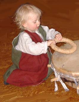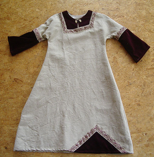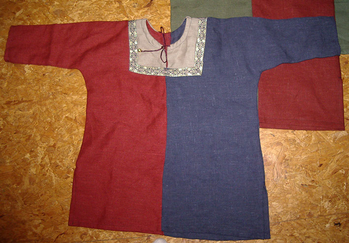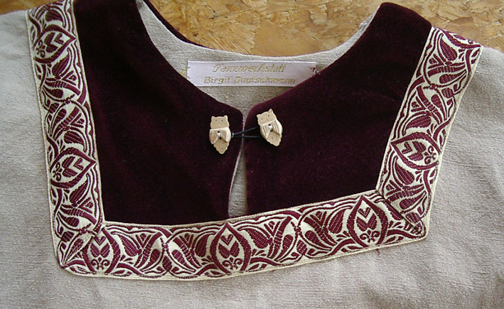 Tunika aus gröberen Leinen, Bändchen am Halsausschnitt mit kleinen Glöckchen und Borte.