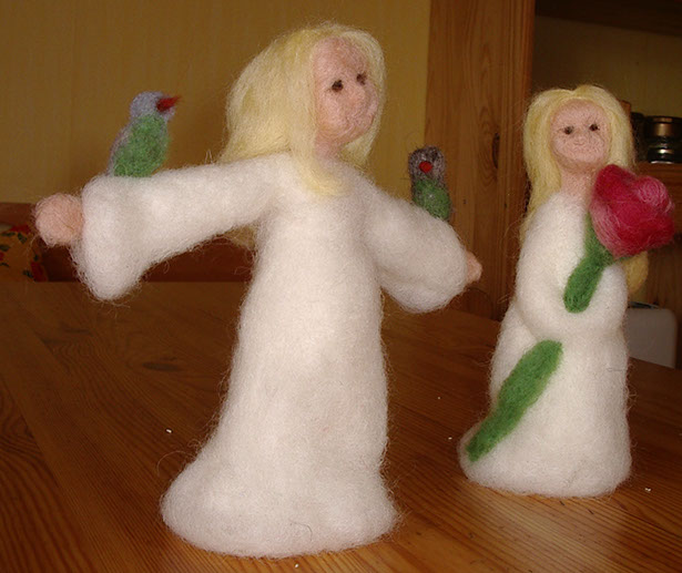 Hand-gefilzte Elfchen mit Vögeln, Blume oder anderen Dekorationen